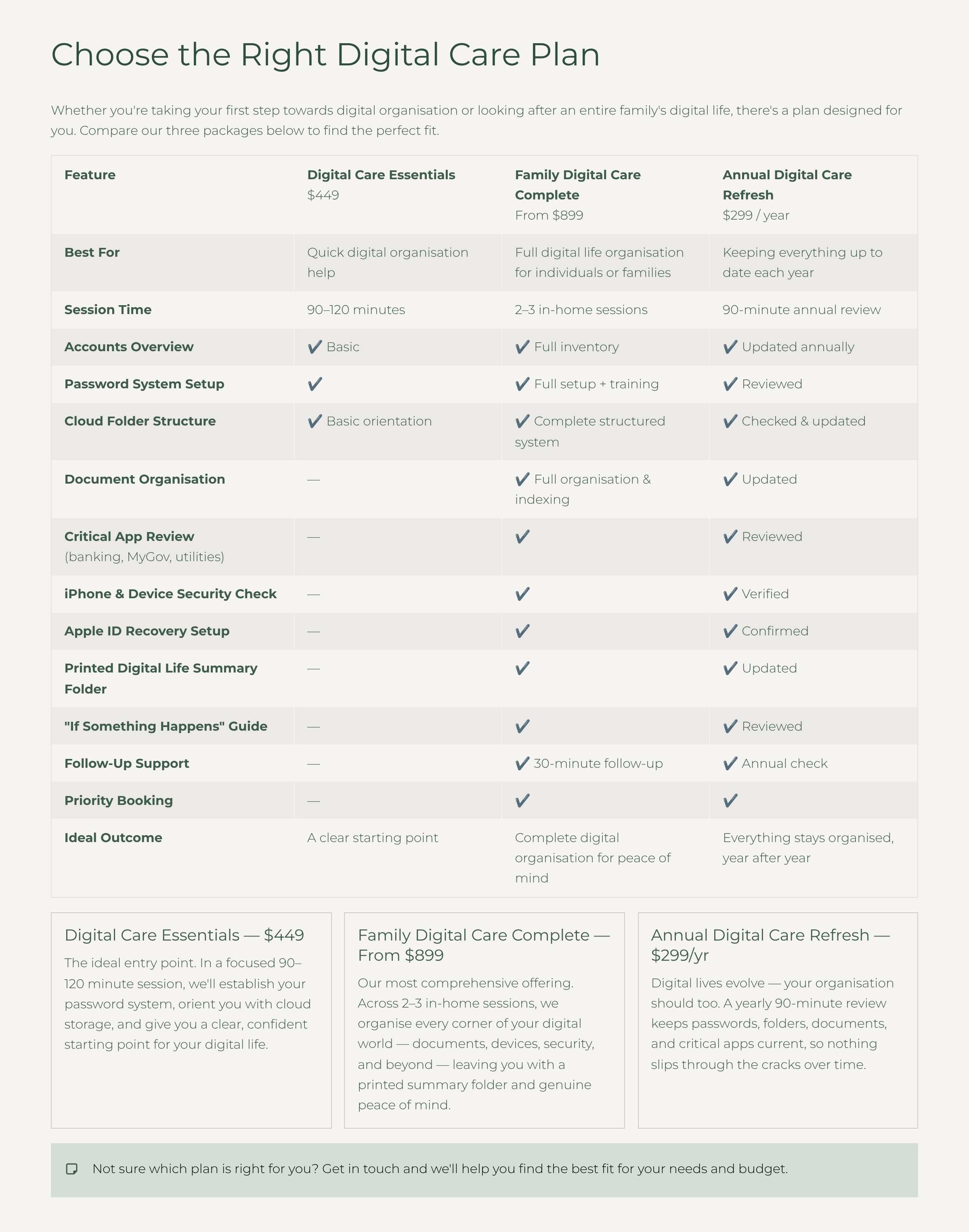 This 90-minute annual session ensures your digital life remains structured, clear and easy for you — and for your family if they ever need to step in.
